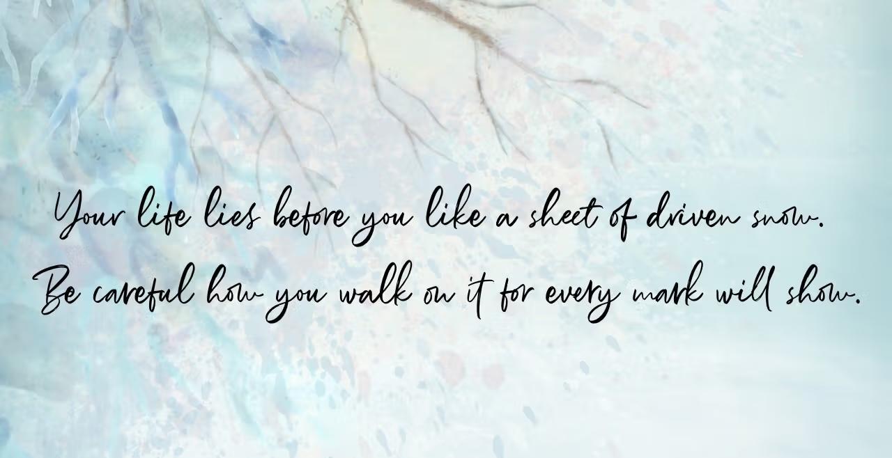 The ones I loved most were the words of affirmation. Right at the front of the book Aunt Rose had written “your life lies before you like a sheet of driven snow. Be careful how you tread on it, for every mark will show”