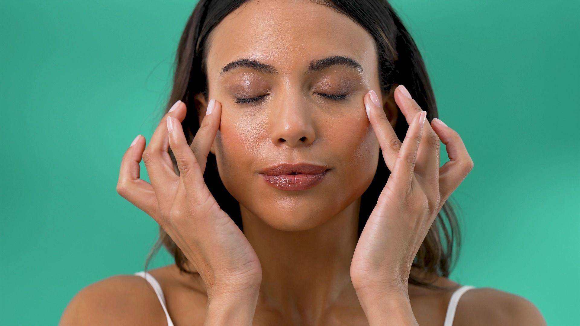 Pat gently around the eye area, being careful not to drag the skin, pat from under the brow outward, then inwards under the eye.